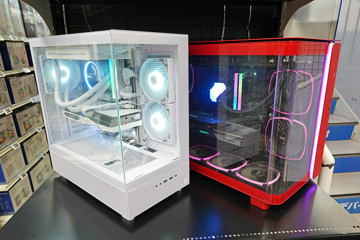 店内をざっと見ていると、目が留まる場所に自作ゲーミングPCのデモ機が展示されている。ホワイトやレッドを基調にしたものやパステルカラーのモデルなど、ちょっと個性的な見た目のPCになっている。
