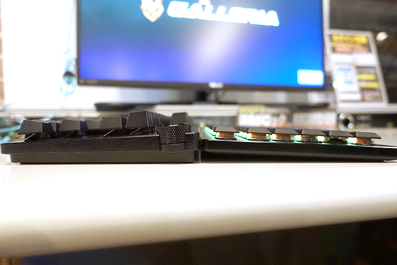 またキースイッチの違いとして、高さが異なる「ロープロファイルスイッチ」も存在する。高さを抑えたスッキリした外観も特徴だが、押し込める深さも浅くなっているため、ノートPCなどのキーボードから移行しても違和感が少ないという。また、キーが浅いため体感上の入力遅延が少なく感じるという利点もあるという。