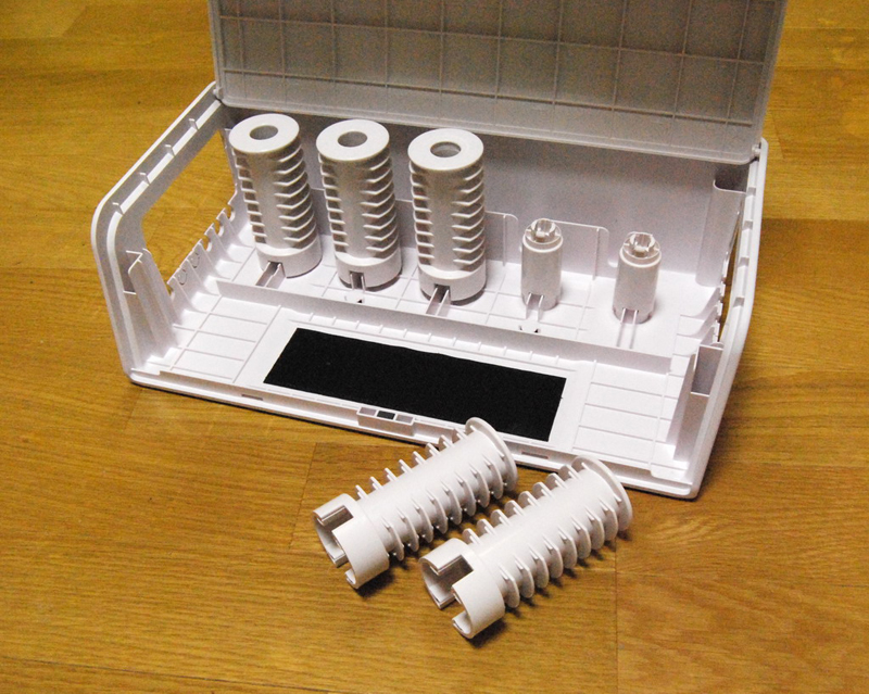 蓋を開けると、付属品であるリール(溝が切られた円筒形のパーツ)をセットする箇所が5点(写真では3個をセット済み)と、手前に面ファスナーが貼られた箇所がある