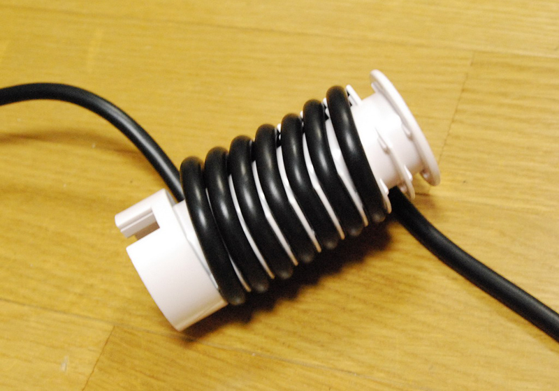 実際の使い方は、まず電源コードの真ん中付近をリールに巻き付ける。溝の切られていない部分を使ってらせん状にするのが基本だ