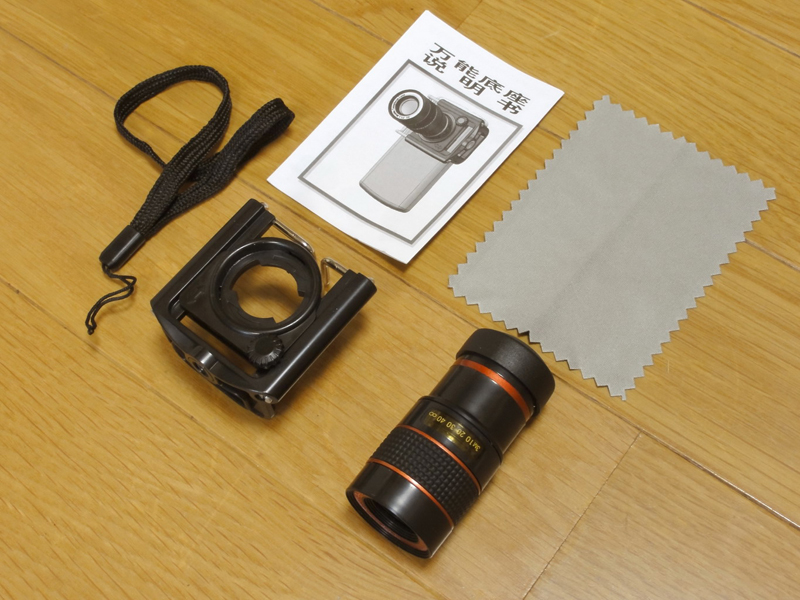 「DN-MPLENZ」の内容物一式。実際に使用するには、右手前にあるレンズと、その左にある携帯電話へのクリップ「ユニバーサルホルダー」の2つが必要になる