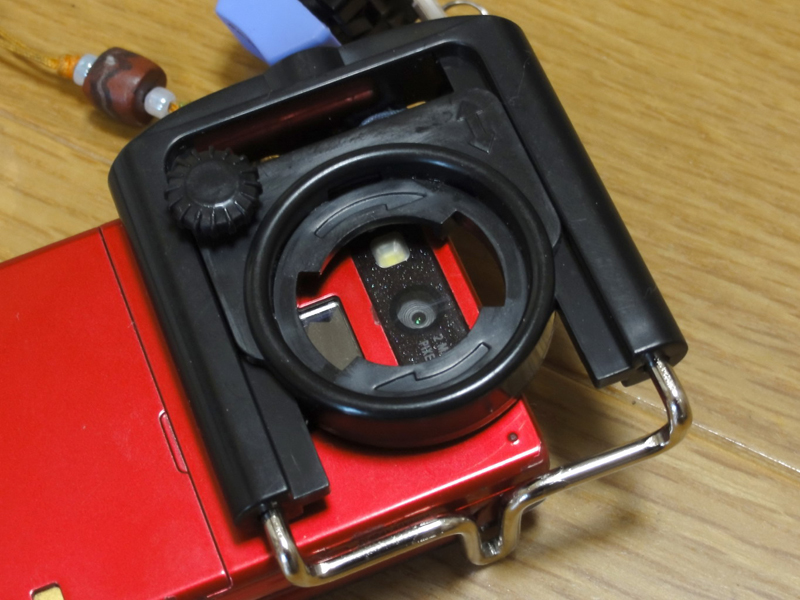 ユニバーサルホルダーを携帯電話に装着した状態。金属の棒を引っ張って電話機を挟み込み、その後で写真左にあるネジを緩めて、携帯電話側のレンズとホルダー側のレンズ装着部を合わせる。ネジを締め直せば装着完了だ