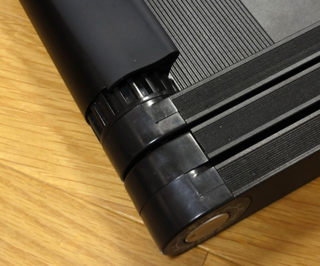 天板と脚の基本素材は、軽量なアルミ製だ。間接部(写真手前)にはプラスチックが使われている。天板部にある周辺よりさらに黒い部分は、ゴム製のパームレストである