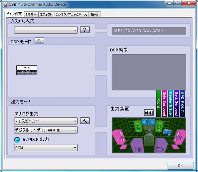 コントロールパネルのメイン設定画面。サラウンドスピーカーの本数や、バーチャルサラウンド効果の切り換えが可能。スピーカー位置調整(音量バランスの調整)もサポートしている
