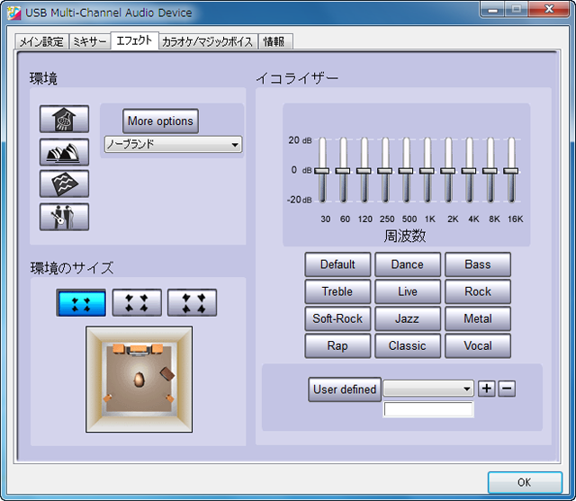 コントロールパネルのエフェクト画面。デジタルリバーブ(エコー)の設定となる「環境」とイコライザーの操作が可能だ