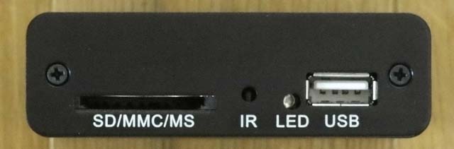 本体正面には、SDカードスロットとリモコン用のIR(赤外線)窓、動作状態を示すLED、USB 2.0端子がある。なお、カードスロットの表示にはMMCカードやMS(メモリースティック)も記載されているが、上海問屋でのサポートはSDカードのみとなる
