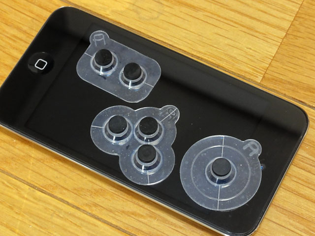 タッチパネル用ゲームボタン「DN-SPACC-MGCP」のパッケージ。最下段にはiPhone&iPod touch用と書かれているが、他の主要なスマートフォンでも使用可能だ。表面には、方向キー(十字キー)の役割をする円形コントローラーパーツが2個ある