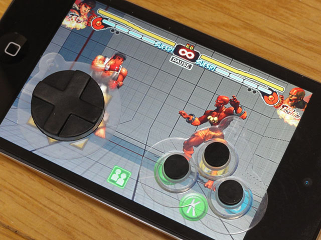 円形コントローラーに加え、3ボタン用のボタンパーツも貼ってみた。やはり画面のボタンに合わせて距離が調整されているため、位置をピッタリと合わせることができる。ちなみに本文で紹介したように、この状態でさらに1ボタンを追加して使うことはできない(吸盤が干渉する)のが残念