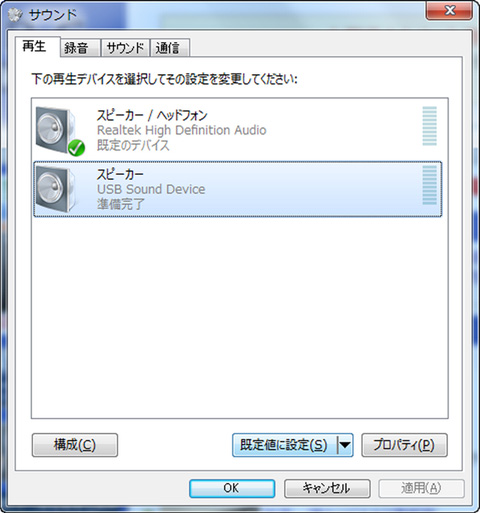 本機はUSBサウンド機能内蔵タイプなので、音を鳴らすには設定が必要だ。Windows 7の場合、接続してドライバのインストールが終了した後、通知領域のスピーカーアイコンを右クリックし、「再生デバイス」を選択。表示される「サウンド」画面でリストの「スピーカー USB Sound Device」をクリックし、続いて下の「規定値に設定」をクリックすればよい