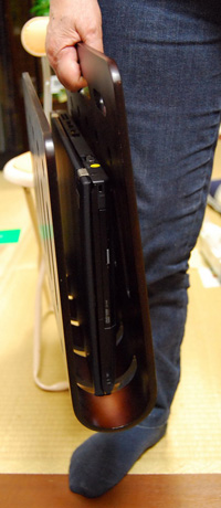 U字型の形状と手前の取っ手を活かして、ノートパソコンと一緒に持ち運ぶこともできる。5cm程度の厚みのノートパソコンでも楽々入れられる