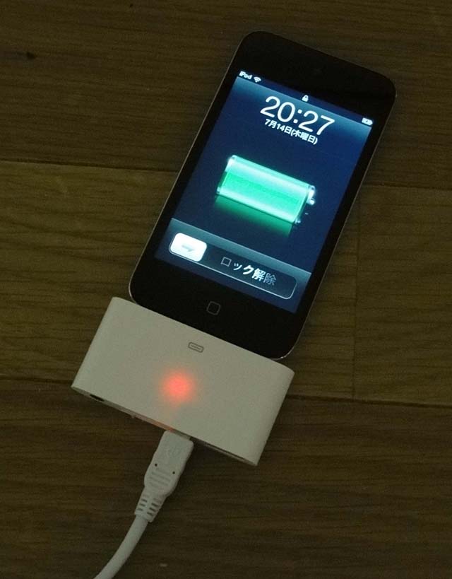 iPod Touchに本製品と付属ケーブルを接続して、充電・同期中の状態。このように本体内蔵のランプが赤く光るので、本体のディスプレイが消えていても接続状態がわかる