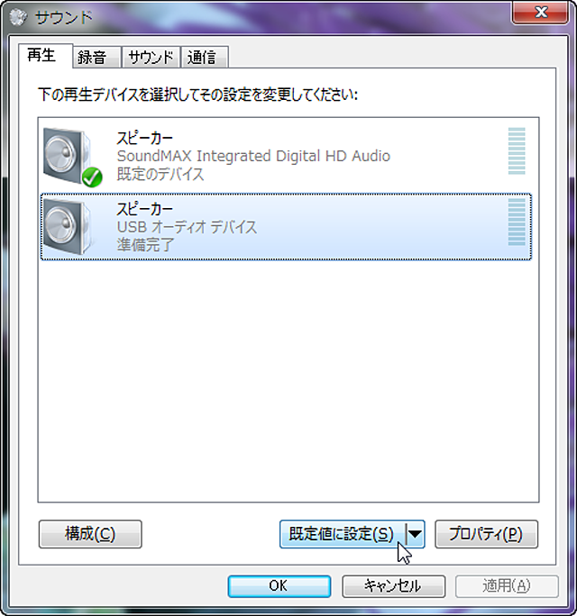 通知領域のスピーカーアイコンで「再生デバイス」を選択すると、この画面が表示される。中央のリストから「スピーカー USB オーディオ デバイス」をクリックし、続いて右下の「規定値に設定」をクリックする