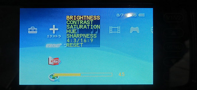 画面調整用の設定メニュー。設定は上部のメニュー一覧と下部の調整量メーターで確認できる。PSPメニューの映りから、おおよその画質も判断できるだろう