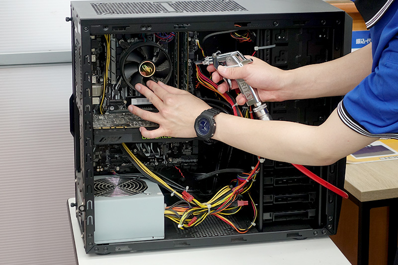 このコンプレッサーはかなり強力で、フルパワーではパーツを破損してしまうほどのパワーがあるとのこと。清掃作業時には、PCに精通したスタッフが細心の注意と共に適切な風量へ調整しながら清掃を行ってくれる。