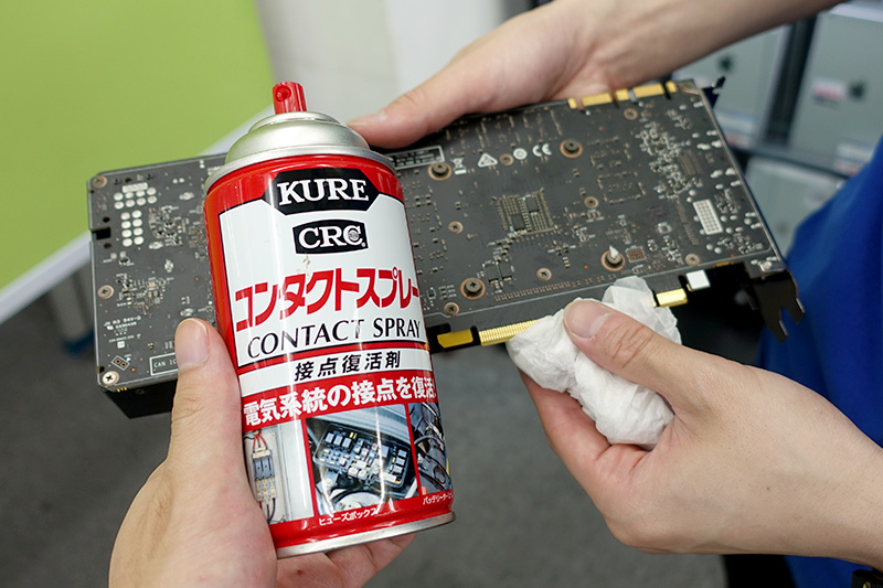 ビデオカードもホコリが除去されて基板本来の色が復活。一旦取り外されたビデオカードやメモリモジュール、PCIeやメモリの接点も綺麗に清掃されてから再装着されている。