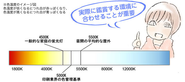 つまり、太陽の下で写真を見るようなときは5500Kに、家庭の蛍光灯の下で写真を見るときは4500Kに調整したモニターを使えば、ほぼそのままの色を再現できるということになります。印刷する場合も同じで、太陽の下で見ることを想定して印刷をするなら色温度は5500K辺りに調整したモニターでレタッチ作業などを行わないと、思った色は出ず、想定外の色味の印刷物が仕上がってしまいます。
