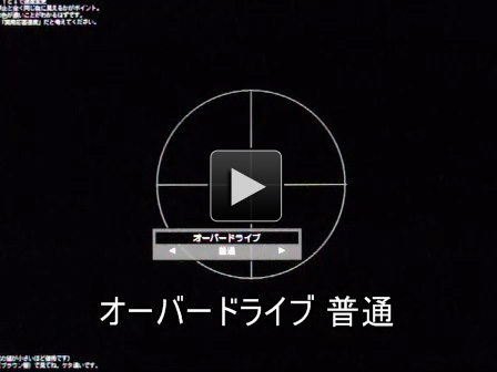 なお、下にフリーソフトの「LCDBENCH」を用いて、オーバードライブ設定の効果を比較した動画を示す。LCDBENCH側は十字円の移動速度を3ms更新とし、撮影はカシオのEXILIM EX-FC150にて240Hz高速度にて行っている。オーバードライブ設定オフ時は十字円が描ききらないうちに移動してしまうため、線分の色が薄いが、「普通→強」と上げていくと、描画速度が上がり(=応答速度が上がり)これがはっきりとした色になっていくのが分かる。