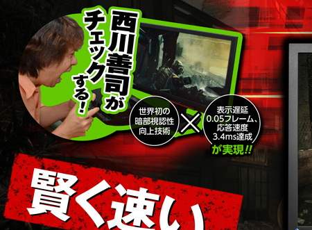 具体的には、低表示遅延性能においては、驚きの0.05フレーム(60Hz時)未満を達成し、そして高速応答速度性能においては3.4msを実現したのだ。ちなみに、2012年6月現在で、「表示遅延0.05フレーム」「応答速度3.4ms」は、業界最速を謳っている。