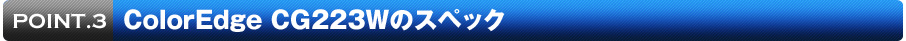 先に「FlexStand」、そして「白が綺麗」と言った、一見して分かる「これは!」と思ったものを書いてしまい、順序が逆になってしまったが、「ColorEdge CG223W」のスペックを抜粋すると以下の通り。