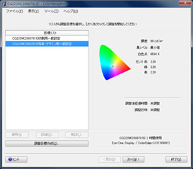 今回は「i1 Display 2」を使ってチェックした。操作方法は非常に簡単で、CD-ROMからドライバ、そしてアプリケーションをインストール。「ColorNavigator」を起動すればいい。初めに使用しているセンサーを選び、次はターゲットとなる調整目標を選択する。筆者の場合は、「写真・デザイン用一般設定」にしている。この時、輝度:80cd/m2、黒レベル:最小値、白色点:6500K、ガンマ:2.2となる。後はセンサーを画面に合わせてセット、実行すれば、モニターは調整済み。モニターのカラーモード「CAL1~3」にセットされ、ColorNavigatorからいつでも呼び出しが可能だ。これなら初心者でも簡単に、そして完全にモニターを調整できるだろう。