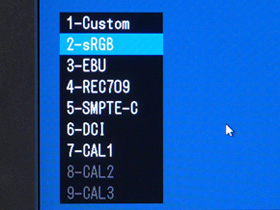 カラーモードは、sRGB、EBU、Rec709、SMPTE-C、DCIの5パターンに加え、CustomとCAL(Calibration)×3 の計9つとなる。通常用途では十分な範囲だ。