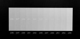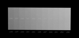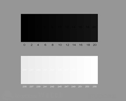 黒側は(0・0・0)(2・2・2)~(20・20・20)と白側(255・255・255)(253・253・253)~(235・235・235)の階調を並べてある。このチャートを「CG242W」で表示し、Nikon D3でRAW撮影する。適正露出での撮影と黒側の階調を顕著にするために5段露出を明るく撮影した。またRAW現像時に色温度を整えコントラストを0にして現像してある。 白側はトーンカーブでコントラストを高くして各スケールの差がわかるようにしてある。