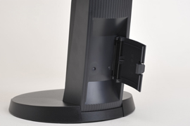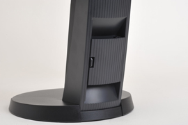 | デザインが一新された「FlexStand 2」を採用。広範囲の位置調節が可能にもかかわらず、液晶面もしっかり安定している | 縦位置利用のためのピボット機構も備える | 円形のスタンド底面。左右各172°のスウィーベル機構を持ち、動きもなめらか。液晶をしっかりと支えている |