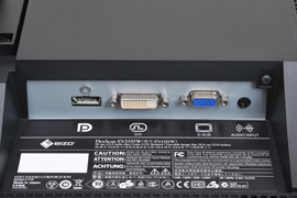 EV2335Wでは、従来モデル同様、DisplayPort×1、DVI-D(HDCP対応)×1、D-Sub15ピン×1と、3系統の映像入力端子が用意されている。映像用途や一般ユーザー向けの液晶モニターで不可欠なHDMI端子は用意されていないが、純粋にPCのみを使い倒す用途には対応機器の増えてきているDisplayPortの方がHDMIより使い勝手が良いだろう。また、サウンド面では従来モデル同様、内蔵スピーカーがモノラル仕様のため、ステレオ音声入力端子を用意するとともに、左側面にはヘッドホン端子が用意されている。