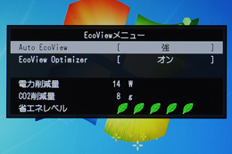 ところで、EV2335Wでは、従来モデルに搭載されていた人感センサー「EcoView Sense」が省かれている。一方で、調光制御機能の「EcoView Optimizer」が新たに搭載された。これにより、周囲の明るさに応じて快適な調光制御を行う「Auto EcoView」の機能に加え、画面の表示コンテンツの明るさ(まぶしさ)も加味した、より快適な調光制御が行われるようになった。さらに、LED特有の超低輝度への調光も可能となっている。こういった新機能の搭載により、EcoView Senseを省いたとしても、十分に優れた省電力性能を実現しつつ、さらに疲れ目の抑制などエルゴノミクス性を強化しているわけだ。また、輝度に応じた節電度合いを確認できる「EcoView Index」機能も従来モデルから強化され、現在の電力削減量やCO2削減量も表示されるようになった。