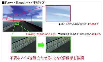 Power Resolution機能は、最近流行のいわゆる「超解像技術」的な効果をもたらすもので、映像中の高周波部分に対し選択的にシャープネス向上をもたらすものだ。具体的にはテクスチャ表現や色ディテールが際立ち、見た目の解像感が上がることになる。映像中の低周波部分、つまりは、なだらかなグラデーション表現などに対しては解像感強調は行わないので、映像全体がノイジーにはならない。
