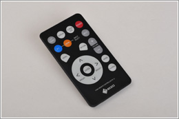 商品セットにはカード型のリモコンが同梱されており、入力切換や画調調整などは、リモコン上の操作ボタンを押すことで簡単に行える。ディスプレイ下部の少ないボタンの難解なOSDメニュー操作を行わなくてもいいので使い勝手がとてもいい。音量操作やミュートなどは直観的に行えるし、入力切換も[PC]ボタンと[HDMI]ボタンを押し分けることで瞬間的に希望の入力系統に切り替えることができる。
