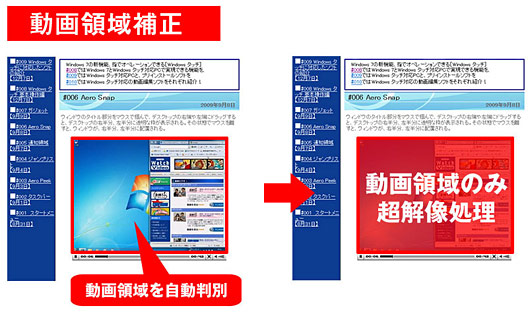 そして、あと2つ、「動画領域補正」機能と「文字補正」機能は、特に、PC画面上でネット動画を楽しんだりするユーザーに特に嬉しい補正支援機能になる。