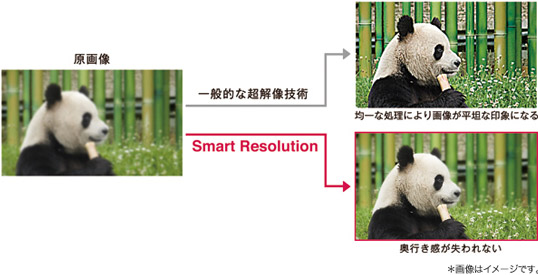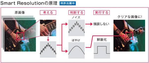 前者の「ノイズ感の強調」問題に関しては、Smart Resolutionでは、入力映像の解析をさらに進め、着目している階調や色の変化に「ある程度のノイズ成分が乗っているかもしれない」と仮定して、「ノイズ成分」と「ぼやけ量」を分離して演算処理するようになっている。つまり、もともと乗っていたノイズ成分は強調せず、解像感の足りない情報のみに対して超解像処理を施すのだ。