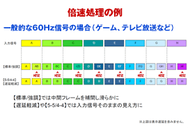 | 遅延軽減 | 補間フレームを生成せず、直前と同じフレームを繰り返して表示。映像表示時の遅延を最小で0.5フレームに抑える。 |