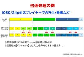 | 5-5/4-4 | 補間フレームを生成せず、同じフレームを繰り返して24Hz表示(毎秒24コマで表示しているように見せる)。映画などのフィルム映像を原画に忠実に再現。 |