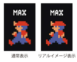 最近の液晶テレビや液晶モニターは、低解像度映像をなるべく滑らかに表現しようとマルチサンプリング方式のフィルターを使って解像度変換を行ってくれる。一般的な映像コンテンツならばそれはありがたいのだが、ドット画として構成されたファミコン世代のレトロゲームの映像に対してこの処理が入ると、せっかくのカクカクしたドット画の味わいが損なわれてしまう。ということで、あえて高画質な解像度変換を行わないモードとしてEIZOが開発したのが、この「リアルイメージ」機能だ。