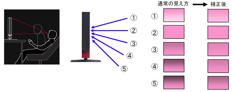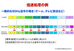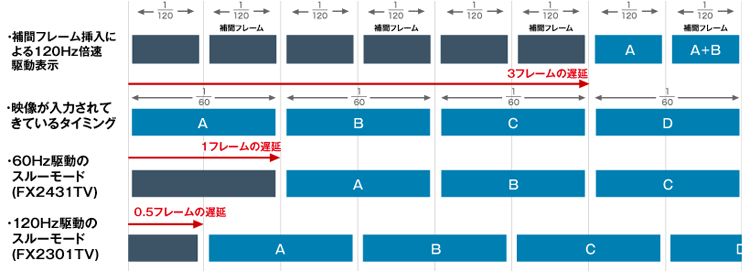 | 遅延軽減 | 補間フレームを生成せず、直前と同じフレームを繰り返して表示。映像表示時の遅延を最小で0.5フレームに抑える。 |