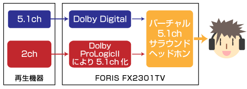 FORIS FX2301TVのサウンド機能はこれだけではない。凄い…と思うと同時に、今までどうしてなかったんだろう?…と思える嬉しいサウンド機能「バーチャルサラウンドヘッドホン機能」が搭載されているのだ。FORIS FX2301TVはDolbyDigitalとDolbyProLogicIIに対応したデコーダを内蔵しており、マルチチャンネルサラウンドサウンドの再生に対応しているのである。