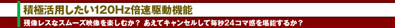 用意されているモードは「標準」「強調」「5-5/4-4」「遅延軽減」の4つ。通常は補間フレームを次フレームにブレンド表示する「標準」で問題ないはずだが、より補間フレームを支配的にして積極的に残像を低減させたい場合は「強調」を利用するのもいいだろう。一方、映画ファンやHiFi派にお勧めしたいのは「5-5/4-4」モードだ。これはオリジナルの映像が、毎秒24コマ映像ならば、倍速駆動回路に同一フレームを5回表示させ(5-5)、毎秒30コマ映像ならば4回表示させる(4-4)ことで、実質的にオリジナルのフレームレートに相当するコマ数で表示してくれるモードになる。そう、このモードでは、あの毎秒24コマらしい、フィルムジャダー付きの映画らしい味わいが楽しめるのだ。なお、最後の「遅延低減」は前段で解説したスルーモードに相当する設定だ。ある特定の入力端子にゲーム機しか接続していない場合など、スルーモードを固定的に活用したい場合にはあえてこの設定を選ぶのもいいだろう。