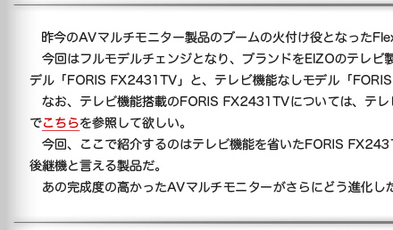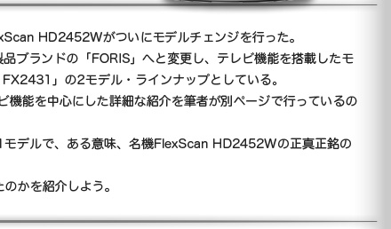 筆者はプライベートで先代のFlexScan HD2452Wを所有しているのだが、その先代オーナーの目からみて、今回のFORIS FX2431との画質の差は、すぐ分かる。