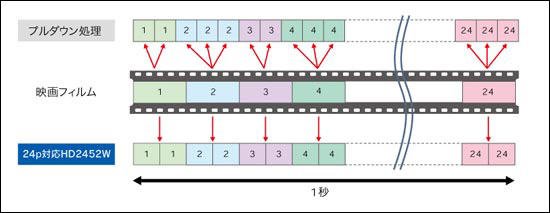 この1080/24pとは、フルHD解像度の映像で毎秒24コマ(24fps)表示とするフォーマットのことで、主に映画やアニメのソフトなどで採用例が多い。従来の映像機器では24fpsを60fpsにフレームレート変換して表示する2-3プルダウン表示が主流だったが、これはスクロールするシーンなどで動きがカクカクしてしまうことがあった。FlexScan HD2452Wでは、1080/24pのネイティブ表示に対応しているので、ぎこちなさがない。PS3とFlexScan HD2452WをHDMI接続してブルーレイの映画やアニメを再生したときにはこの機能が自ずと働く。