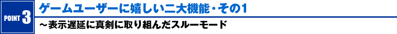 こうしたバックグラウンドを受けて開発されたFlexScan HD2452Wは、ゲーム機と接続した場合の表示遅延低減に設計段階から真剣に取り組んだ数少ない製品だ。FlexScan HD2452Wには「スルーモード」と呼ばれるモードが搭載されており、このモード時には、内蔵された高画質化エンジンをスルーし、最高速で映像表示を行ってくれるのだ。