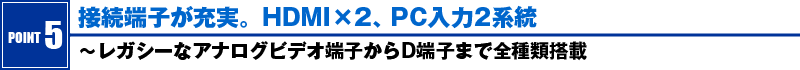 最新のデジタル端子だけでなく、アナログビデオ系の端子も充実している。コンポジットビデオ入力端子、S2ビデオ入力端子といったレガシー端子はもちろん、DVDプレイヤーやWiiとの接続では利用頻度が未だ高いD4入力端子も装備している。