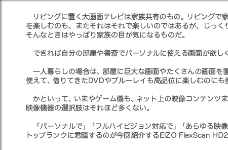 もちろんFlexScan HD2452Wが明るすぎるということもない。PCモニターとして使う場合には画調モード(カラーモード)を「テキスト」に設定すれば長時間PC作業に向いたPCモニターライクな画調にできるからだ。