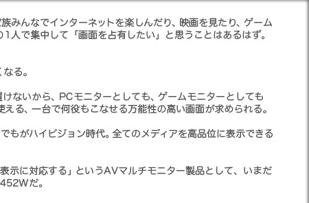 同種製品は増えつつあるが、PCモニターとして、ゲームモニターとして、パーソナルサイズの映像鑑賞用モニターとして、「画質」「PCモニターとしての本質」「接続性」「操作性」の全てに妥協していないホンモノの製品は未だFlexScan HD2452Wだけ。
