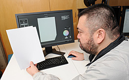 その作業が済んだら測定を行う。測定には、EIZO EasyPIXに付属のセンサー(EX1)を使う。センサーはPCとUSB接続し、測定時には画面上にぶら下げて固定する。本来のカラーマッチングに必要なモニター表示の緻密な設定は全て、このセンサーとEIZO EasyPIXソフトウェアが自動的に行ってくれるのだ。