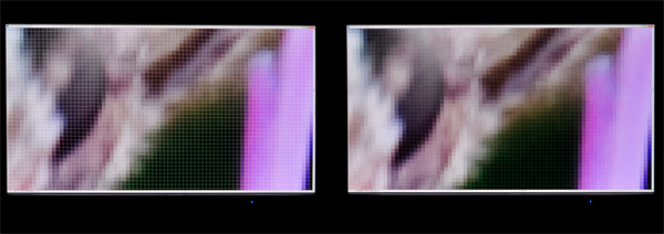下の写真は、上の写真を3200%表示にし、Nikon D3で撮影した写真で、Photoshop CS5による擬似的ドット表示になっている。それを利用して同じ座標同士を見比べると、色はほぼ同じに見えるが、10bit表示の方がドットの境界線が鮮明で、左右の写真でRGBの色を測定して比べると、明らかに色が違うドットもある。