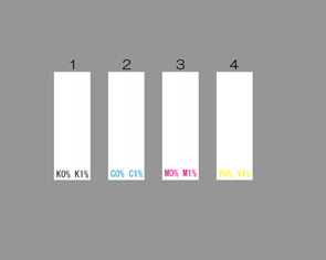 CMYK各色1%のテストチャート。白の右半分をCMYKの各色を1%で塗りつぶしている
