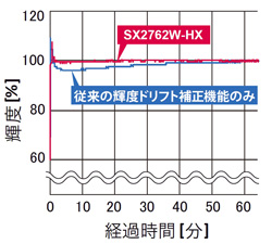 PCモニターは、一般的には電源を入れてから30分程度たたないと、本来の色や明るさは表示できないものだ。なので、私はキャリブレーションするときも、電源投入後30分以上待ってから行うようにしている。しかし、待つというのは面倒なことで、Webのニュースなどを見ているうちに、キャリブレーションすることをすっかり忘れてしまうこともある。もちろん、写真をレタッチをするにも待たないといけないが、待っていられない状況が多々あるのが実情だ。だから、電源投入後に急いでレタッチした写真を見て、後からやり直すこともしばしば。そんな私に朗報が! FlexScan SX2762W-HXは、「輝度ドリフト補正機能」がさらに進化して搭載されているという。右の図を見てもらえば分かるように、電源投入後、設定の輝度まで数分以内にほぼ安定してしまうという。これなら写真のレタッチもキャリブレーションも、電源投入後あまり待たずに作業を始めても問題なさそうだ。緊急の修正作業などが発生しがちな、DTPユーザーや映像編集をよく行うユーザーには、特にありがたい機能なのではないだろうか。