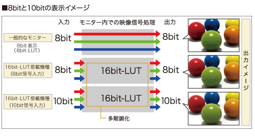 ナナオのモニターがプロ御用達なのは、モニター内での映像信号処理能力がぬきんでているからだろう。FlexScan SX2762W-HXでは、16bit-LUT(Look Up Table)を採用して、約278兆色の中から最適な約1677万色を表示することにより、階調整が細やかになっている(8bit表示時)。また、10bit出力のできるビデオカードを利用すれば、FlexScan SX2762W-HXに10bit信号が送られ、16bit-LUTで信号処理し、10bitで出力(画面表示)されるのだ。従来のPCモニターでは、8bit入力した情報を8bitのLUTで演算処理し8bitで表示していた。その色数の差は大きく、「16bit-LUT」の膨大な色数から最適な色を選べるため、階調がより滑らかに表現できる。